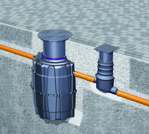 Conform EN 752-1, este necesară o instalație de ridicare dublă în aval (Figura 5) în cazul în care separatorul de grăsime este montat sub nivelul de refulare, sau dacă scurgerile gravitaționale către rețeaua de apă uzată nu sunt fezabile.