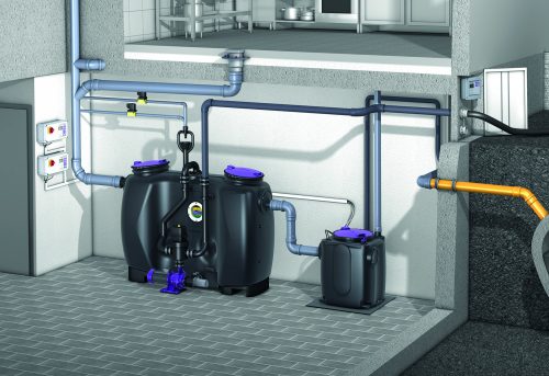The Duo version of the new KESSEL lifting system with two pumps is ideally suited for drainage systems which cannot afford to go off-line. This is particularly applicable to the drainage after grease separators in the commercial sector. One key advantage here are the lateral inlet connections integrated into the system. Inside the tank, these inlets can also be used to take fully norm conform wastewater samples – eliminating the requirement for a separate sampling chamber. The large maintenance opening, which can also be opened with a one-handed closures and without the need for tools, allows easy access for this purpose.